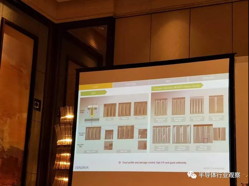 公司的刻蝕設(shè)備在IGBT和Si Super Junction/MOSFET功率器件中也有應(yīng)用。IGBT,也就是現(xiàn)在大家都在推崇的溝槽柵的刻蝕。IGBT刻蝕有很多刻蝕細(xì)節(jié)的要求。一個(gè)是底部形貌問(wèn)題:一種是平的,一種是U形的,還有一種是V形的,這個(gè)形貌非常重要。另外對(duì)Top Corner也是要求非常嚴(yán)格,因?yàn)門op Corner對(duì)Breakdown Voltage影響非常大??偟膩?lái)說(shuō),不管是Top Corner還是Bottom Profile,公司的產(chǎn)品都達(dá)到了很高水平。另外,刻蝕除了對(duì)形貌的要求,還有一些電性的要求,公司也做到了很高水平。公司的刻蝕設(shè)備還可以用于Silicon base的Super Junction??傊究涛g設(shè)備具有好的剖面和損傷控制,高的ER和好的均勻性。