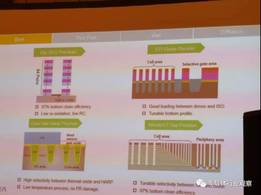 從Etch而言,分為logic和memory,但應(yīng)用層面都比較相似。對(duì)于gate相關(guān)的刻蝕公司具有dry clean,STI等工藝;相同的刻蝕工藝也可以用于DRAM和3D NAND。