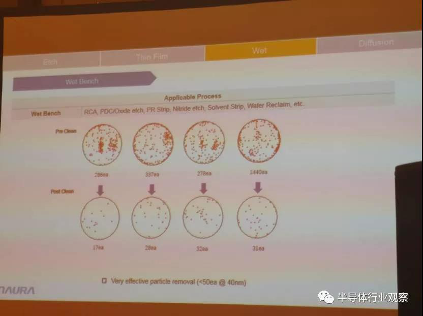 下圖是post etch和polymer removal after TSV etch清洗及其表現(xiàn)。另外則是bench tool,同樣可適用于RCA、PDC/oxide etch、PR strip、Nitride etch、solvent strip和Wafer reclaim等。公司的wet bench tool可以實(shí)現(xiàn)非常高效的particle removal,如下圖所示。