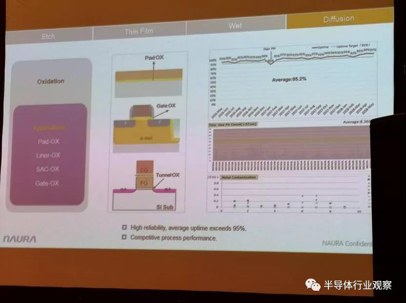 此外就是Oxidation,也就是生長(zhǎng)各種氧化物薄膜,包括Pad-OX、Linear-OX、SAC-OX、Gate-OX等,公司產(chǎn)品具有高可靠性,平均uptime超過(guò)95%,此外公司工藝性能也具有強(qiáng)勁的競(jìng)爭(zhēng)力。