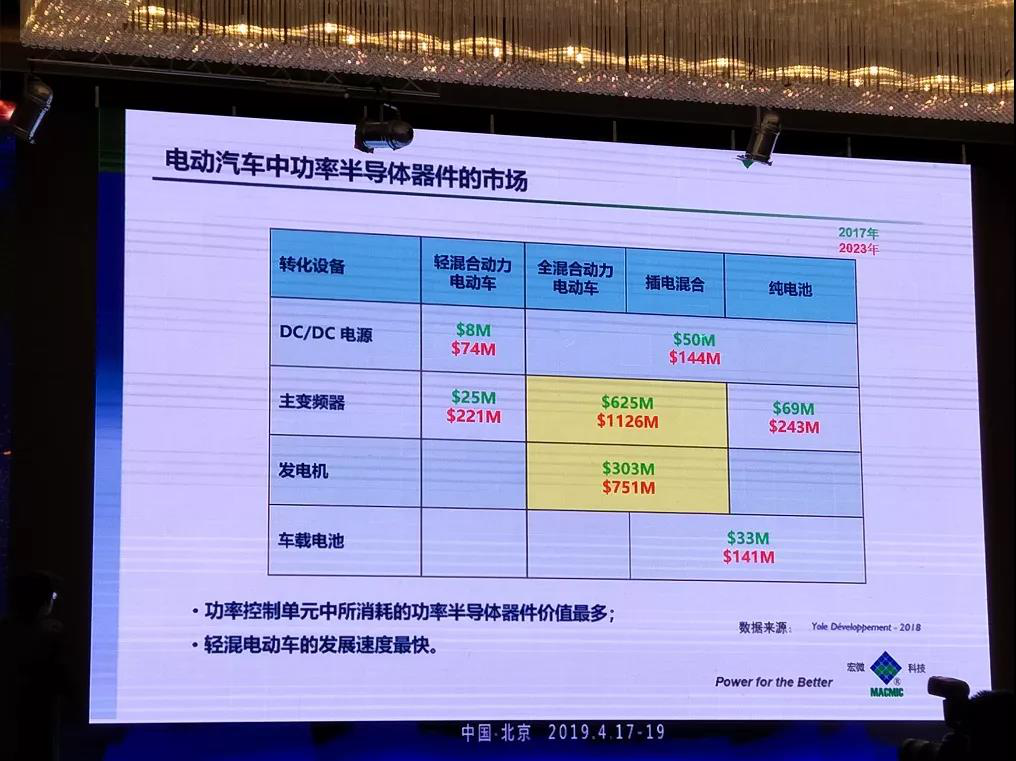 據(jù)宏微科技總裁 趙善麒介紹,在全球電動(dòng)車(chē)功率半導(dǎo)體市場(chǎng),功率控制單元中所消耗的功率半導(dǎo)體器件價(jià)值最多,而輕混電動(dòng)車(chē)的發(fā)展速度最快,具體如下圖所示。