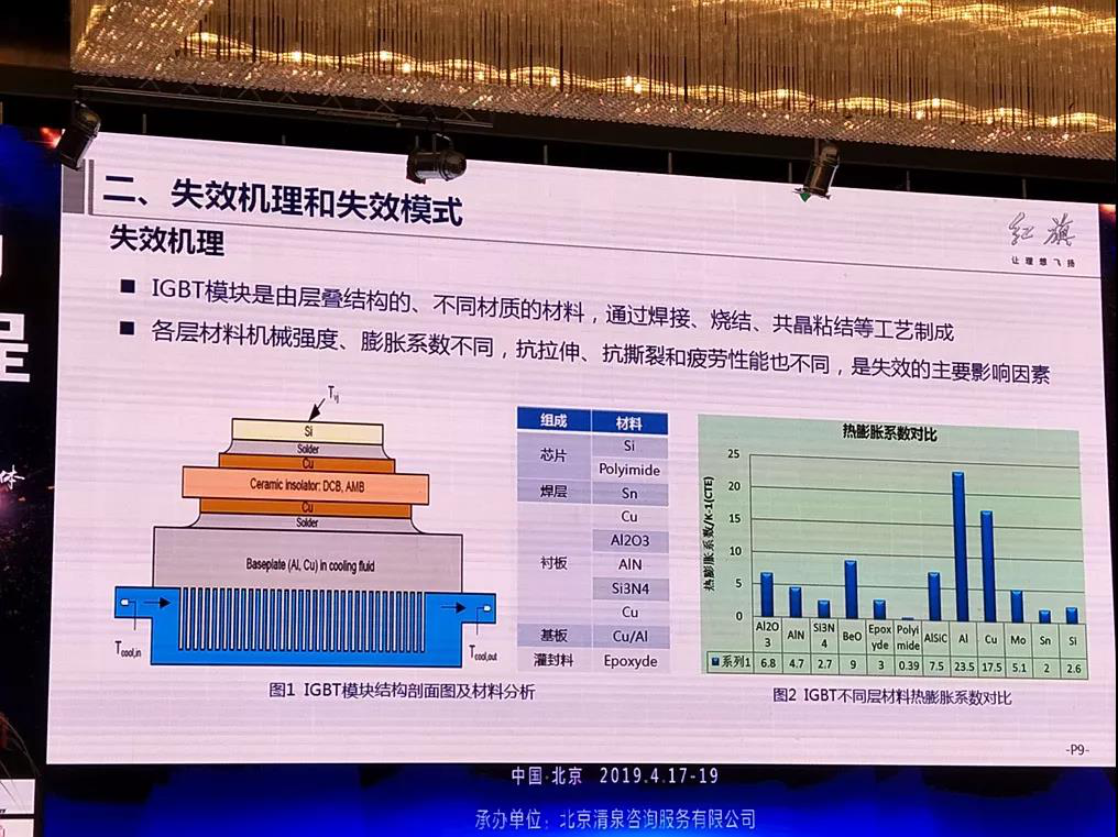 關(guān)于失效分析,趙慧超表示,IGBT模塊是由層疊結(jié)構(gòu)的、不同材質(zhì)的材料,通過(guò)焊接、燒結(jié)、共晶粘結(jié)等工藝制成。各層材料的機(jī)械強(qiáng)度、膨脹系數(shù)不同,抗拉伸、抗撕裂和抗疲勞性能也各不相同。這些都是IGBT失效的主要影響因素。