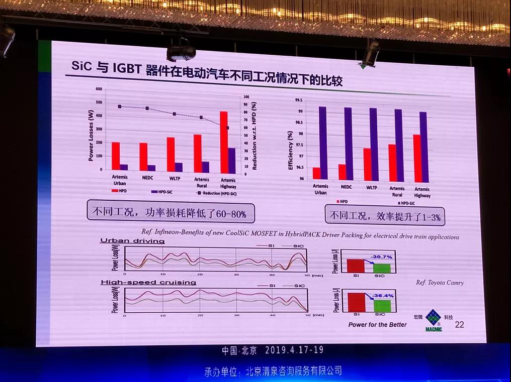 在電動(dòng)車(chē)的不同工況下,SiC器件與IGBT的性能對(duì)比情況如下圖所示,不同工況下,SiC的功耗降低了60~80%,效率提升了1~3%。