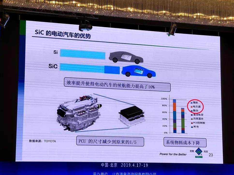 因此,效率的提升使得電動(dòng)汽車(chē)的續(xù)航能力提高了10%,PCU的尺寸減小到原來(lái)的1/5,更為重要的是,系統(tǒng)成本比IGBT的有明顯下降,如下圖所示。