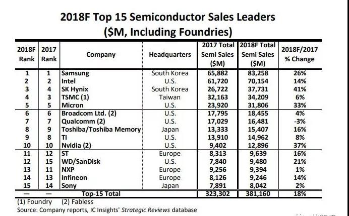 由于擁有三星和SK海力士這兩大明星企業(yè),使得韓國在全球半導(dǎo)體市場有著舉足輕重的地位。特別是在2017和2018年,全球存儲器市場行情大好,價格一路看漲,使得三星在2018年的半導(dǎo)體廠商排名榜單上,一舉超越幾十年如一日的行業(yè)霸主英特爾,成功問鼎,而SK海力士也因為存儲器收入大漲,排名超過了臺積電,坐上了行業(yè)第三的位置。那可以說是韓國半導(dǎo)體最輝煌的時刻。